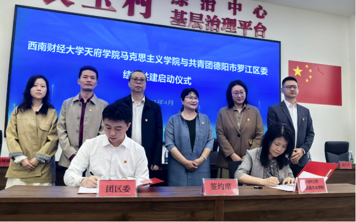 共青团德阳市罗江区委书记冷文啸与西财天府学院马克思主义学院分党委书记、院长丁灵芝与就结对共建进行现场签约。